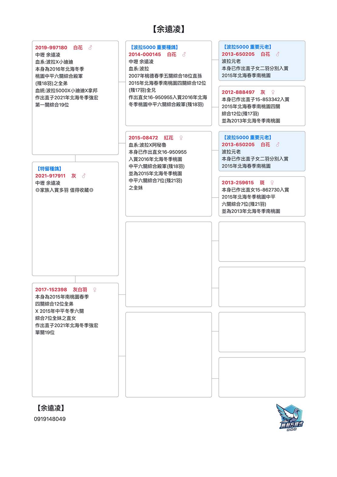 其主血「波拉5000」為最主要基底,輔以長距離名系「小迪迪」、「拿邦號」、「修士肯」造就「花鴿」不敗傳說。