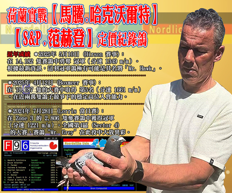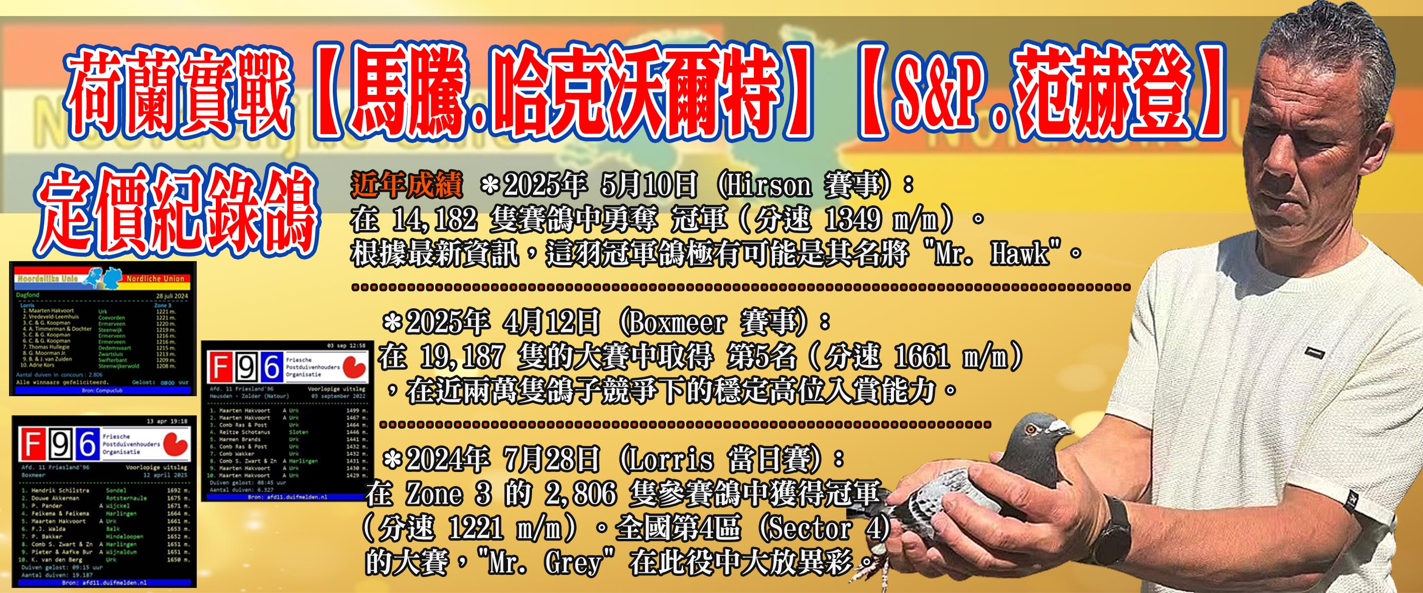 荷蘭名家【馬騰.哈克沃爾特】&【S&P.范赫登】紀錄鴿專場