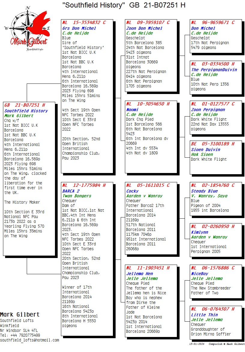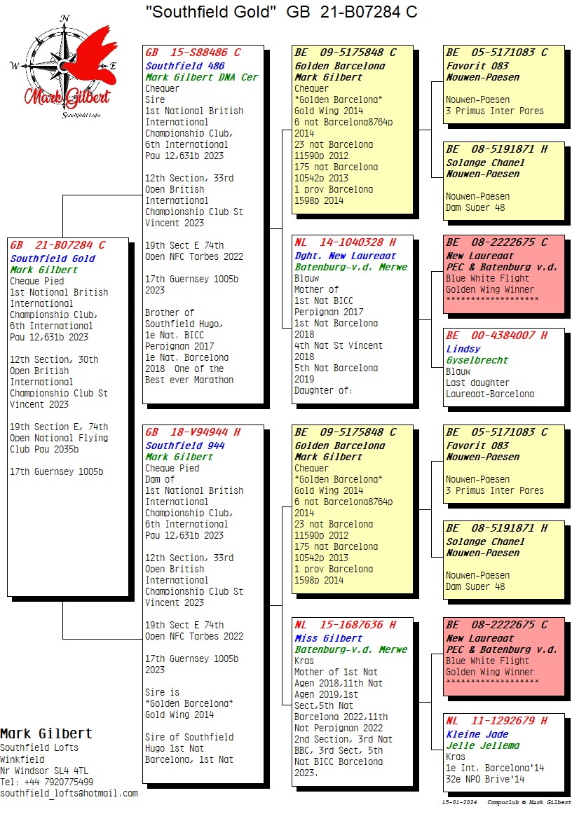 在「南方黃金」的血統書中,我們可以看到「黃金巴塞隆納號」(Golden Barcelona)既是祖父,也是外祖父,「黃金巴塞隆納號」來自諾文-帕森(Nouwen-Paesen),曾獲得2014年金翼獎。我們也看到「新榮耀號」(2013年金翼獎,PEC和巴騰伯格)在血統書中出現了2次,還有耶勒瑪的「小碧玉」。簡而言之,這是一羽真正的巴塞隆納傳奇鴿。