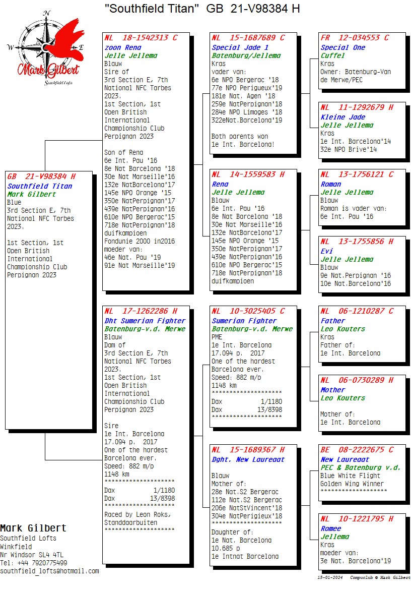 在波品納賽,馬克.吉伯特又收穫了全國賽冠軍。這次是「南方泰坦」(Southfield Titan GB21B07291):賽區冠軍、英國國際冠軍俱樂部冠軍和2023年泰坦長距離獎。 「泰坦」之後,馬克還獲得波品納賽區亞軍和BICC全國4位。