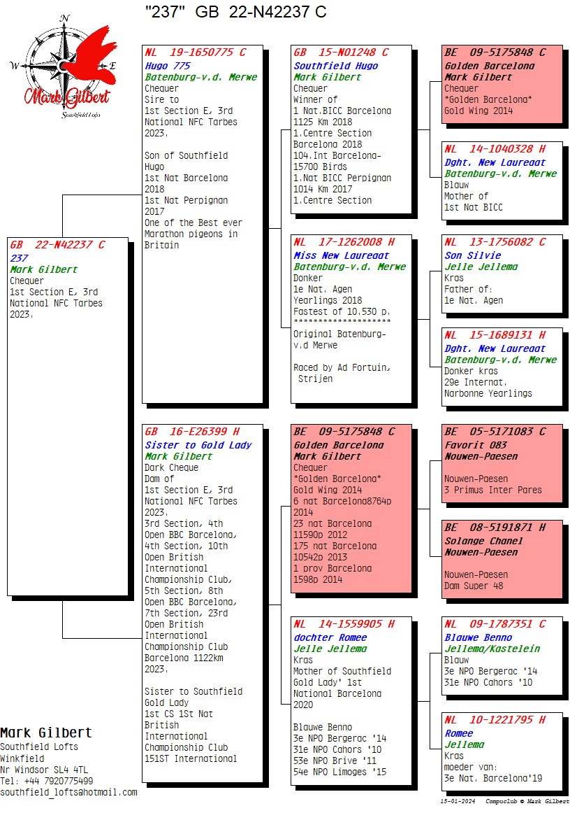 GB22-N42237獲得全國賽飛俱樂部塔碧斯E賽區冠軍和公開賽季軍。這羽雄鴿也同樣出自「黃金巴塞隆納」的血系,在血統書中這羽賽鴿同樣出現了2次。其他3羽祖父母是“南方雨果”(Southfield Hugo,2018年BICC全國冠軍和“黃金巴塞隆納”的直子)、巴騰伯格的“新榮耀號女士”(Miss New Laureaat)和耶勒瑪的“羅蜜直女」(Daughter Romee)。