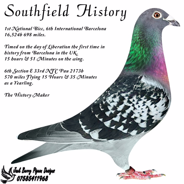 巴塞隆納國際賽每年都是馬克.吉伯特的超長距離戰隊的重點。憑藉著「南方史蹟」的歷史性表現,英國賽鴿當日歸的夢想已經實現。 「南方史蹟」最終獲得:賽區冠軍、英國巴塞隆納俱樂部全國冠軍、國際賽6211羽雌鴿4位和巴塞隆納國際賽16569羽6位。