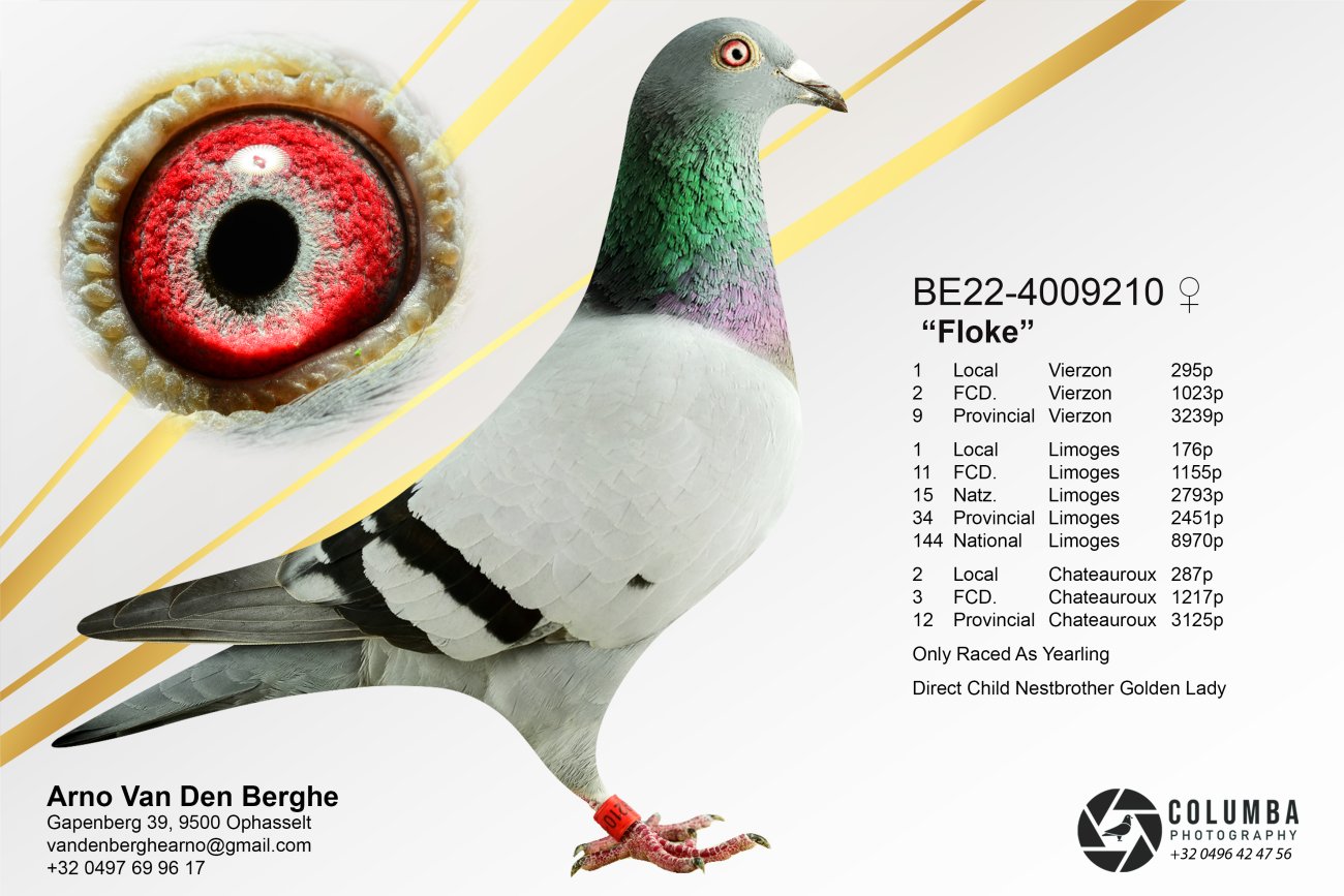 傷心和失望沒有讓阿諾屈服,他開始打造一支「黃金女郎」血系。因此首羽頂級鴿的誕生只是時間問題。很快地一羽賽鴿便已經開始嶄露頭角,這就是「小芙蓉」(Floke BE22-4009210)。她是「黃金女郎」家族湧現的首羽賽鴿,因為她是「黃金女郎」的同窩兄弟BE20-4008637與吉諾.克里克的一羽原舍雌鴿配對作育的。身為一位激情滿滿的冠軍鴿友,阿諾希望能夠充分測試「黃金女郎」的血系實力,因此他決定讓「小芙蓉」參加615公里的利蒙治賽,她此前已經在長距離賽取得了一些優異的成績。是的,「小芙蓉」贏得了冠軍!我們可以得到結論「黃金女郎」血系已經可以在長距離賽場佔有一席之地。