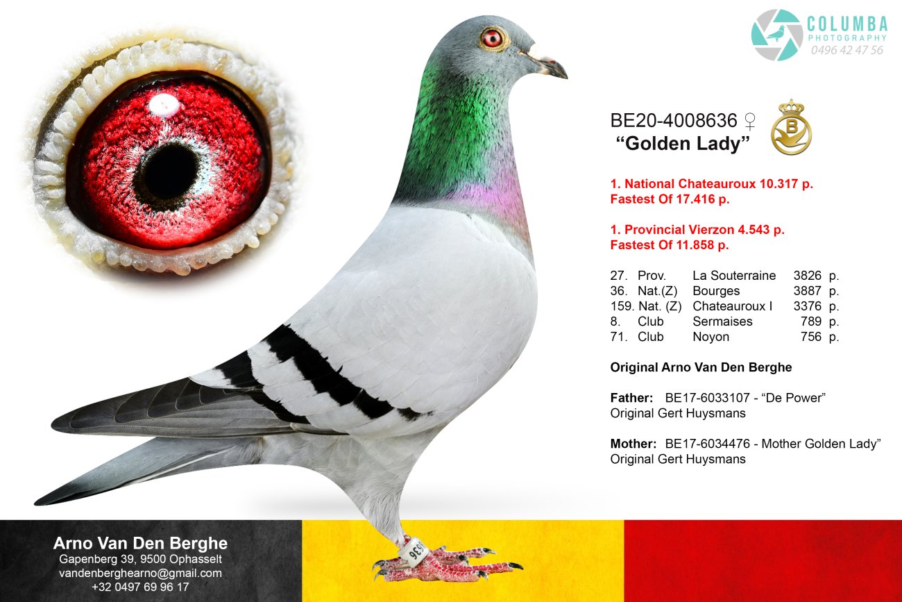 2020年是阿諾養鴿真正的起點,他開始首次在奧法塞爾特的新鴿舍參賽。環號為BE20-4008636的幼鴿在一群同齡鴿中並不顯眼。當時沒有人能夠想到下個賽季這羽小雌鴿會成為備受關注的明星。 2021年一歲鴿首次走向賽場,主要是全省賽和全國賽。首場全省賽從威爾森放飛,上一年還默默無聞的幼鴿隨即獲得全省一歲鴿4543羽冠軍(也是全部11858羽最高分速)。「黃金女郎」(Golden Lady BE20-4008636)很快就展現了她強大的潛力。