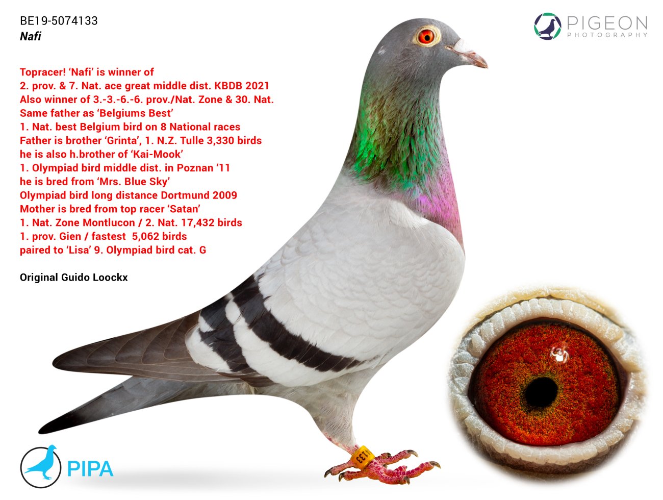 我們要介紹的最後一羽頂級鴿是「納菲」(Nafi, BE19-5074133)。她也是「撒旦」(Satan)的外孫女和「比利時最佳」的同父半姊妹。因此到這裡閉環完成。 「納菲」也取得了令人印象深刻的成績,他已經贏得: