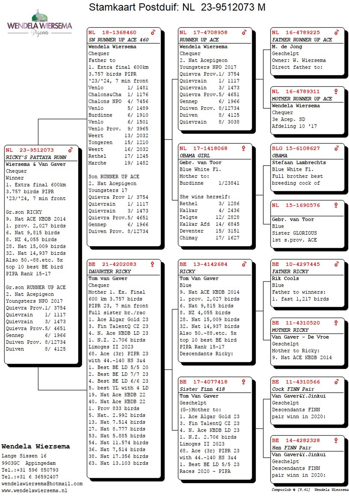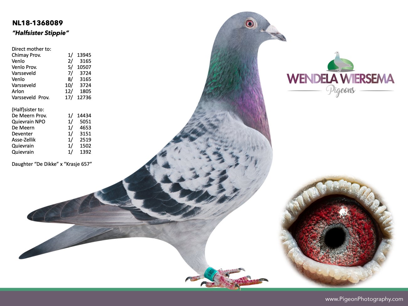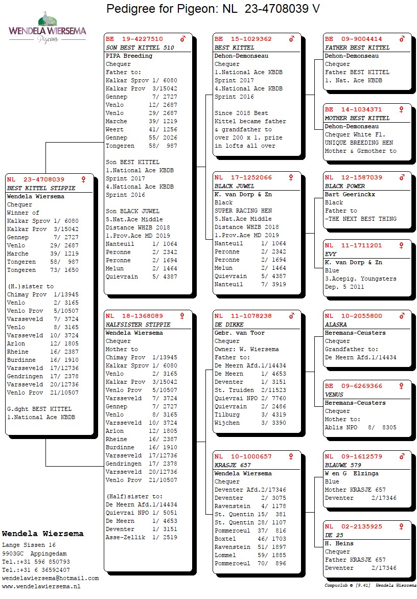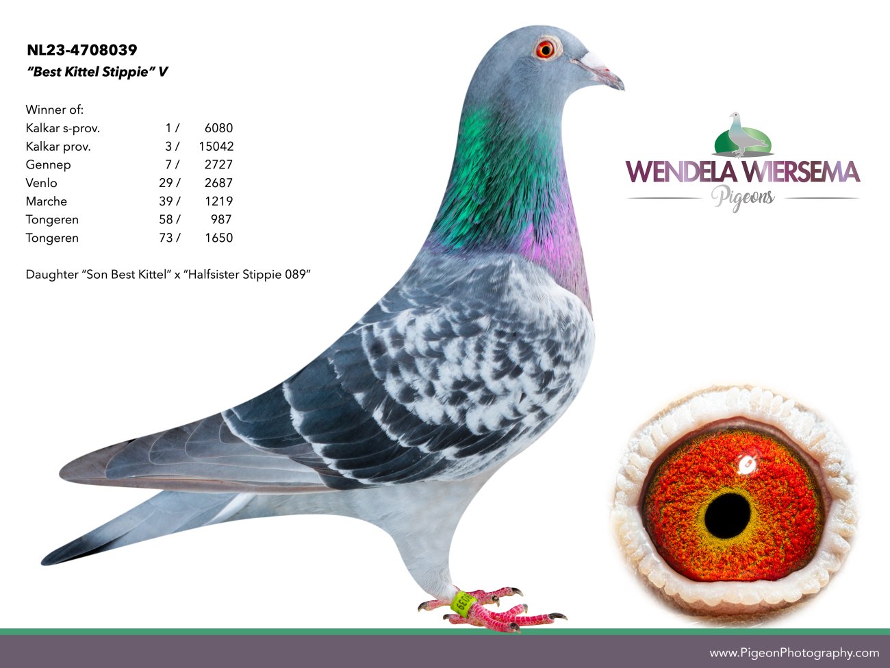 「最佳基特爾斯蒂比」(NL23-4708039 Best Kittel Stippie)是2023賽季汶德拉鴿舍的領先賽鴿,她從開始便表現得十分出色。首次參賽,也就是175公里的卡爾卡賽,她獲得第2聯合會2787羽冠軍。此外她還獲得第1-3聯合會(分區北部)6080羽冠軍。在全分區的成績單中,「最佳基特爾斯蒂比」僅落後2羽賽鴿,獲得15066羽季軍。一週後,她再次展現實力,在吉內普賽中,首先回到汶德拉的鴿舍,獲得第2聯合會2727羽7名。在幼鴿王排行榜,她獲得第2聯合會9位。 「最佳基特爾斯提比」出自PIPA競速育種中心的一羽雄鴿,出自「最佳基特爾」X「黑珍珠」(Black Juwel),與「斯提比半姊妹」(NL18 -1368089 Halfsister Stippie)配對,而「斯提比半姊妹」作育的子代獲得奇梅分區13945羽冠軍。