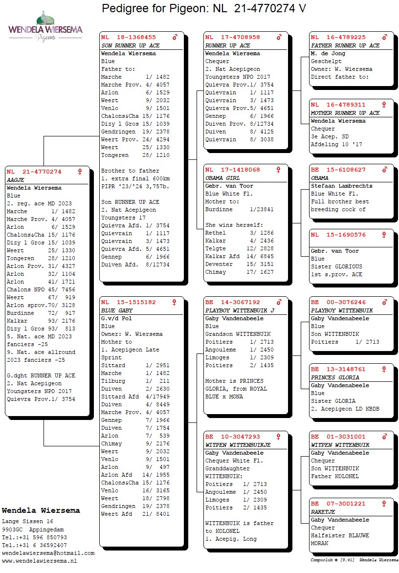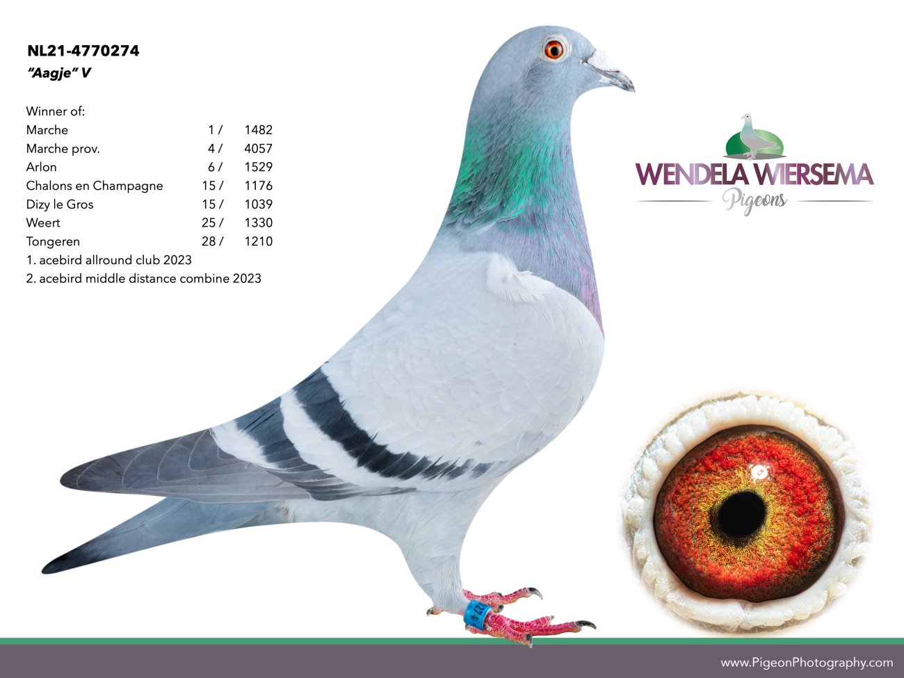 伊蓮娜,汶德拉的妹妹,也在2023年取得高水準的表現。她獲得荷蘭全國25歲以下青年鴿友中距離非指定鴿最佳鴿舍冠軍。她成功衛冕了2022年取得的頭銜。她獲得非指定鴿25歲以下青年最佳鴿友亞軍。「小阿吉」(NL21-4770274 Aagje)是伊蓮娜的代表賽鴿。下面我們為您介紹這羽雌鴿。