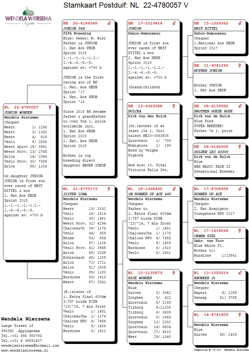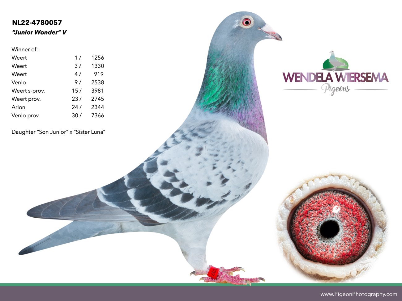 伊蓮娜和汶德拉在7月初的威爾特(243公里)速度賽發揮出色,當時有東南風。在DOP地區,來自格羅寧根東北部8個俱樂部的鴿友展開激烈競爭,這對姊妹可謂難逢對手。伊蓮娜以第一指定鴿「蕾娜」(NL20-1182293 Raina)獲得5位和19位。另外她的全部10羽上籠鴿都獲得入賞。汶德拉的「青蔥奇蹟號」(NL22-4780057 Junior Wonder)獲得第4位。汶德拉還獲得21-22-23-31-37位等,她的20羽賽鴿中,不少於17羽入賞。 「年輕奇蹟號」是PIPA競速育種中心的「青蔥少年」的直孫女,也是「露娜姊妹」(NL21-4770173 Sister Luna)的直女。 「青蔥奇蹟號」贏得了1256羽冠軍、1330羽季軍,現在又獲得了919羽4位。