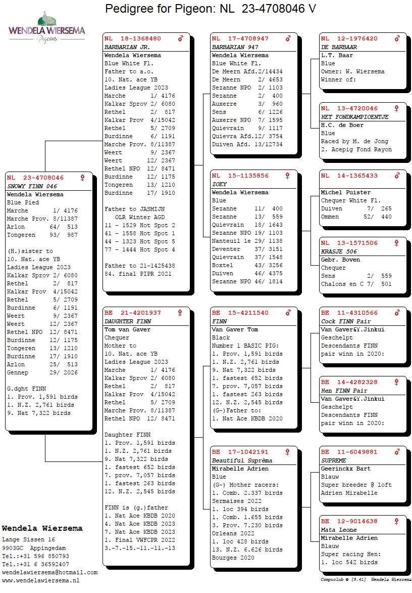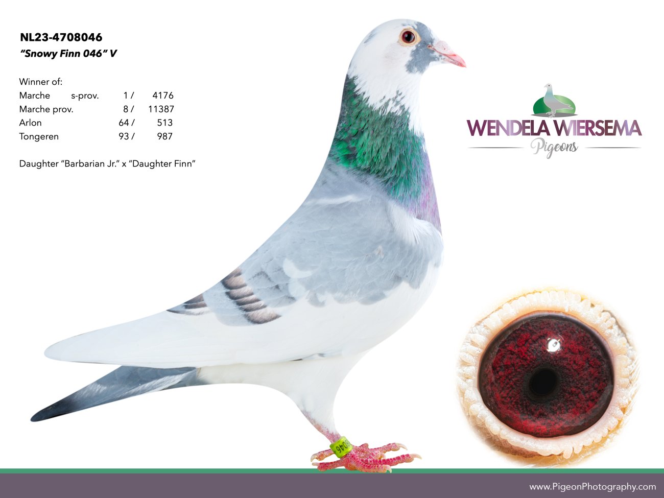 「雪白費恩046」(NL23-4708046 Snowy Finn 046)是「野蠻人費恩078」的全姊妹,她獲得馬爾許(358公里)第2聯合會1934羽冠軍。這羽雌鴿也獲得分區北部地區(第1-3聯合會)4176羽冠軍。在分區成績單上,「雪白費恩046」獲得11387羽8位。在放飛前,東北荷蘭分區的幼鴿壓籠了3晚時間。 「雪白費恩046」參賽9場,入賞8次。