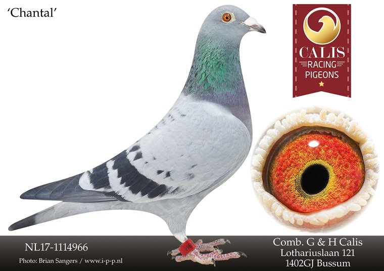 上面成績單的最後一羽冠軍是一歲雌鴿NL23-9195458,她獲得5月19日亞拉斯2,266羽冠軍!亞拉斯前5位再次被卡利斯包辦。這羽冠軍雌鴿的母親是「香塔爾」(Chantal),她的賽鴿生涯也非常精彩,曾獲2019年WHZB全國全能鴿王6位和2019年「王牌精英」全國鴿王6位。