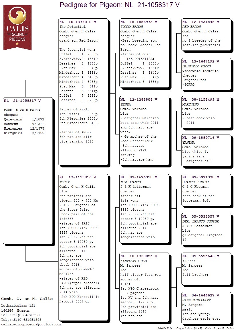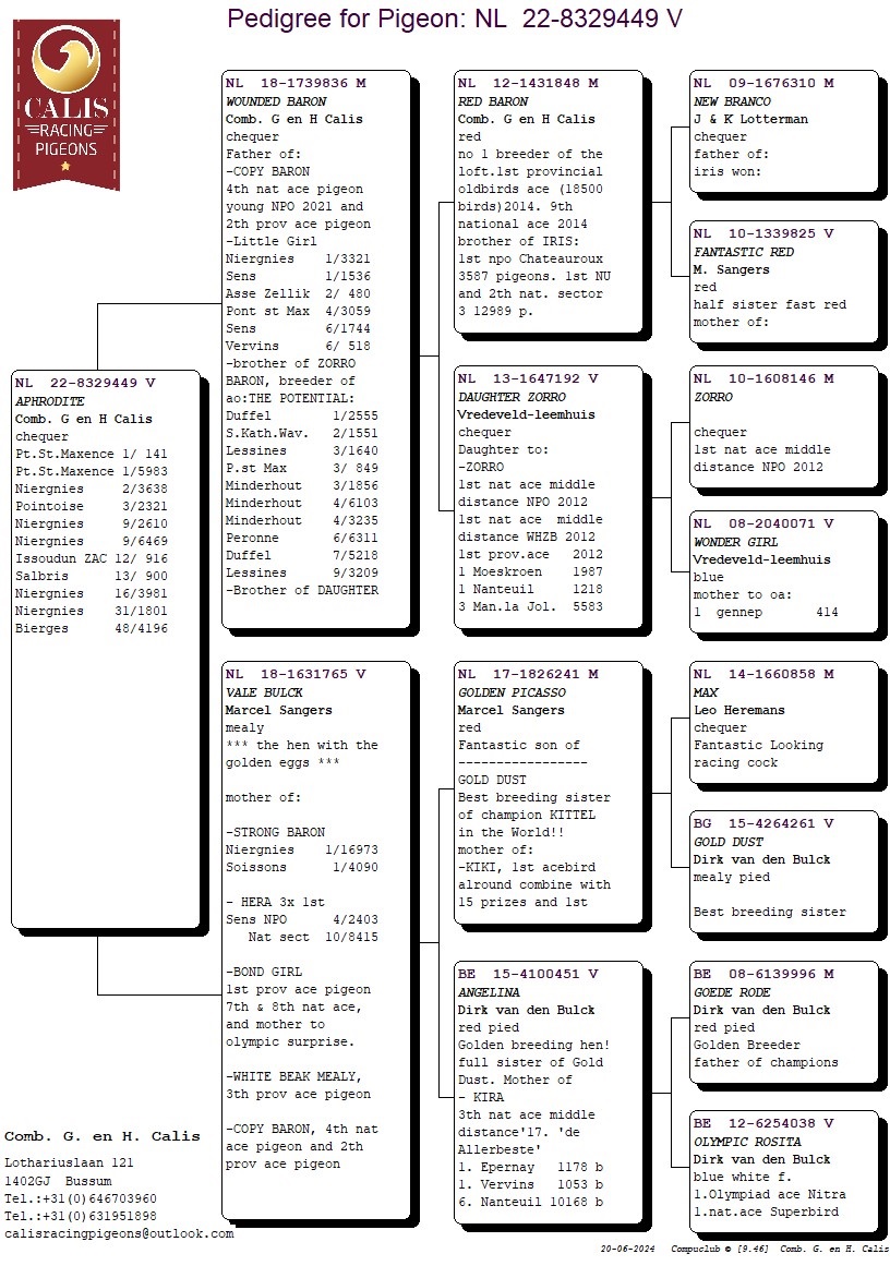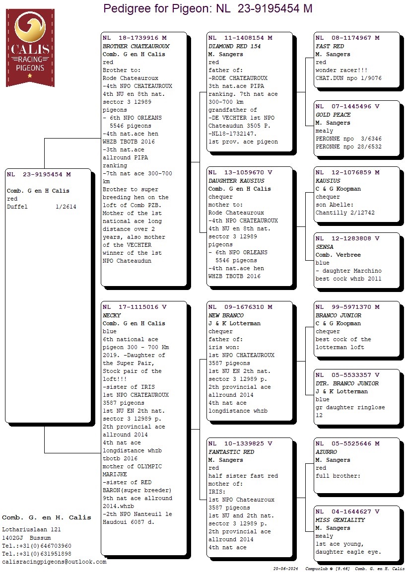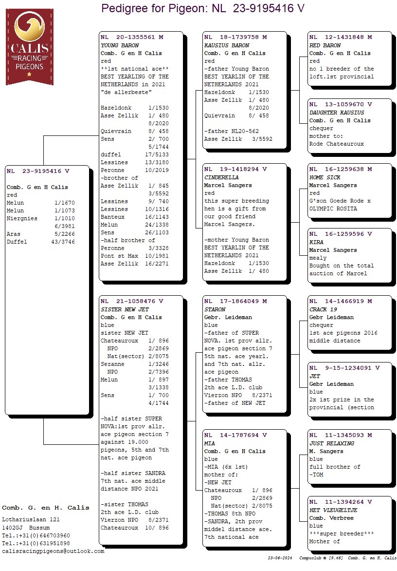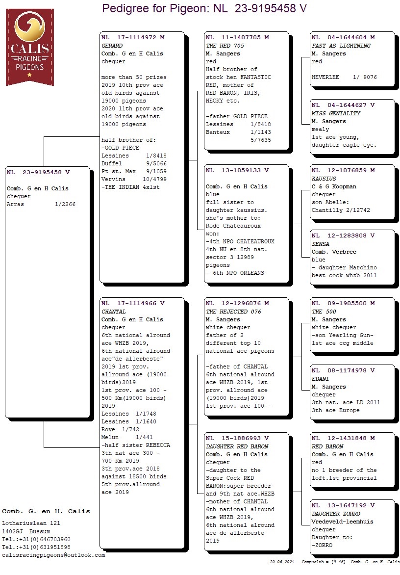 年復一年,父親傑拉德.卡利斯和兒子哈羅德.卡利斯一直名列荷蘭最佳鴿舍之一!這對父子組合一直堅信通往成功的最便捷方法就是擁有大量的頂級鴿。多年來,他們主要引進馬歇爾.山格斯(Marcel Sangers)的鴿子,還有雷德曼(Leideman)、沃迪維德(Vredeveld)、佛布利聯合鴿舍(Comb Verbree)和考夫曼( Koopman)的種鴿。這個途徑的確給了他們豐厚的回報,讓他們多年來一直在大賽中名列前茅,尤其值得一提的是,近年來他們在第7省區和全國級別比賽中獲得眾多鴿王獎!「銀布克」、「斯塔龍」、「年輕霸龍」、特別是基礎配對「新布蘭寇」X「夢幻紅」,他們為卡利斯持續不斷地帶來成功戰績! 2024年賽季,他們的後代仍然在比賽中佔據主導地位!