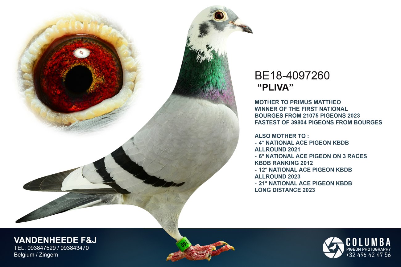 母親「普利瓦」(Pliva BE18-4097260)是一羽優秀種鴿,作育子代獲得2021年KBDB全國全能鴿王4位和2021年KBDB全國長距離鴿王6位。 「普利瓦」出自配對「燧石號」(Flinstone)X「吉曼妮」(Germaine)。