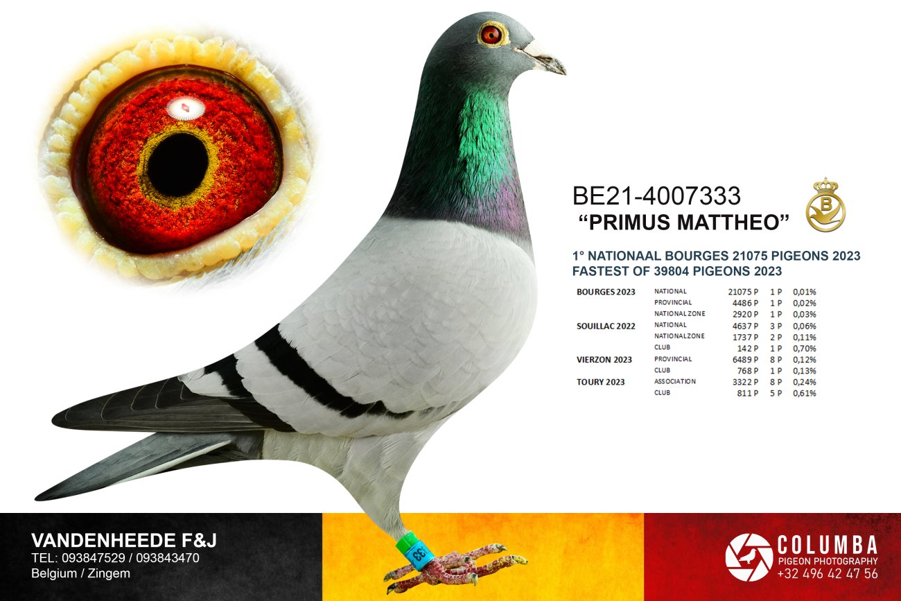 波治I全部參賽鴿總冠軍「冠軍馬提奧」(Primus Mattheo BE21-4007333)戰勝了全部39408羽賽鴿,獲得波治I全國賽成鴿21075羽冠軍。這並非「冠軍馬丁歐」的首項超級賽績,他還取得如下輝煌成績: