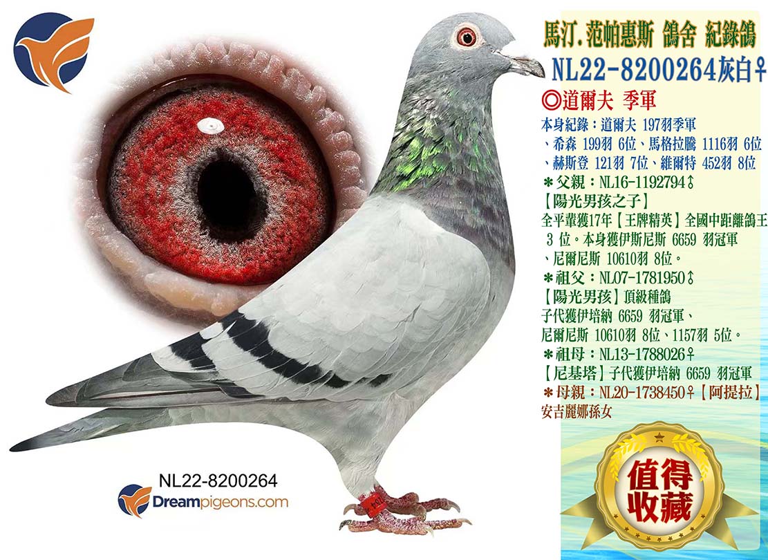 • 紀錄:同母平輩獲 17 年全國中距離鴿王 3 位、伊培納 1178 羽冠軍。